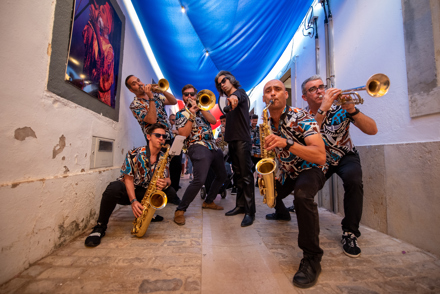 Grupo algarvio que usa a força sonora dos instrumentos de sopro e percussão para levar a alegria da música ao vivo.